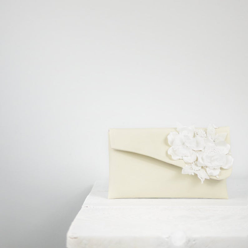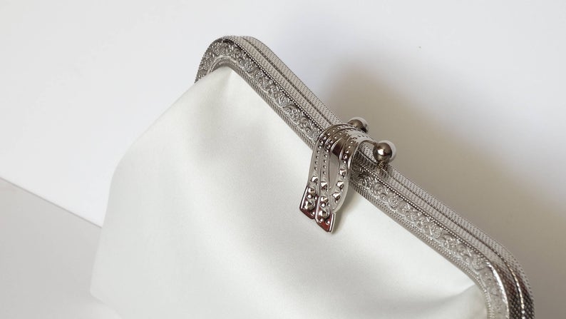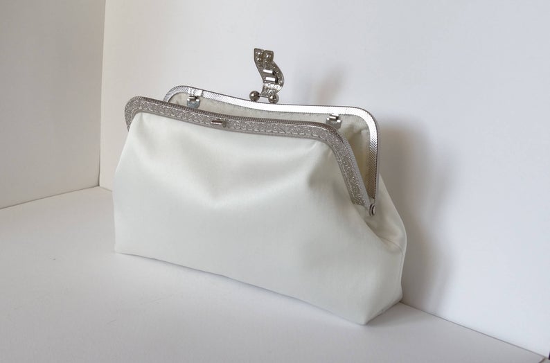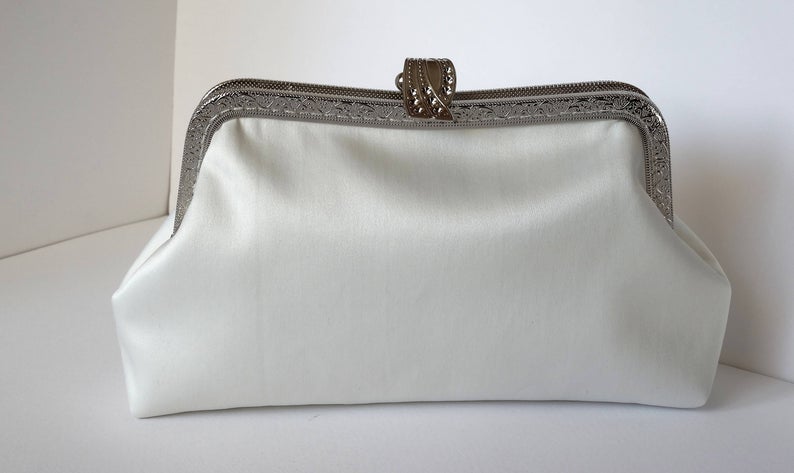 Romantisch ivoren bruidstasje met vintage look. Het is gemaakt van hoge kwaliteit ivoor satijn stof. De sluiting is een zilveren metalen frame. De tas is bekleed met batting en katoenen stof. Je bestelt dit tasje hier.